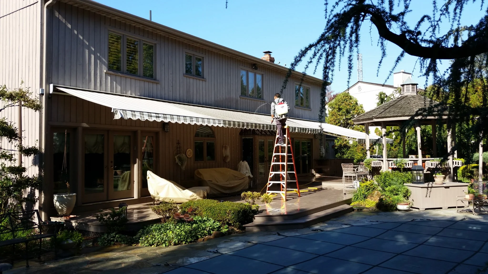 We clean retractable awnings while fully extended, allowing for thorough cleaning and proper drying.